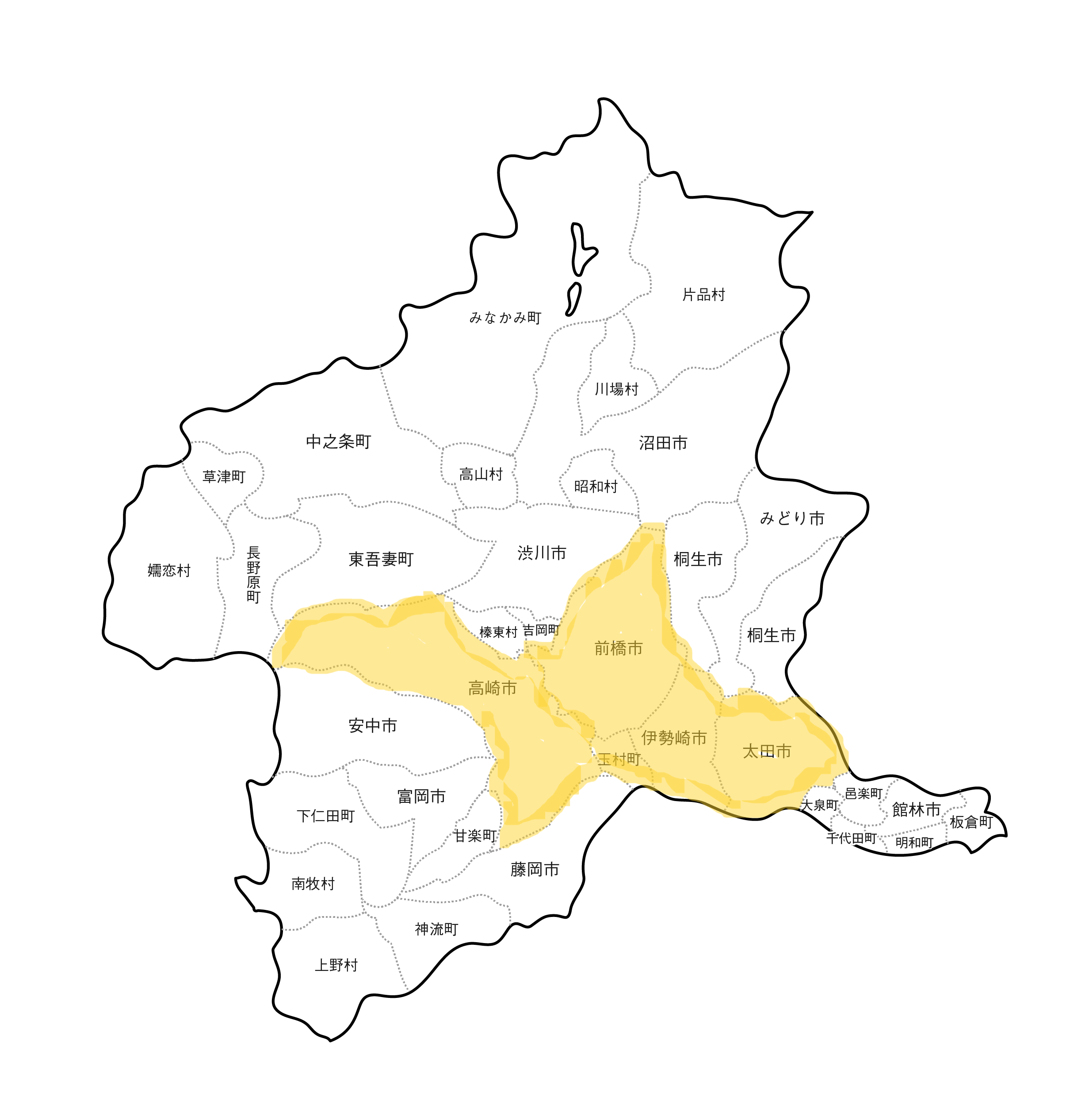 伊勢崎市、太田市、前橋市、高崎市、玉村町